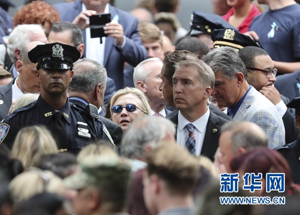 9月11日,在美國紐約,民主黨總統(tǒng)候選人希拉里·克林頓(中,戴墨鏡者)抵達活動現(xiàn)場。當天,“9·11”恐怖襲擊事件15周年紀念活動在美國紐約“9·11”紀念廣場舉行。 新華社記者王迎攝