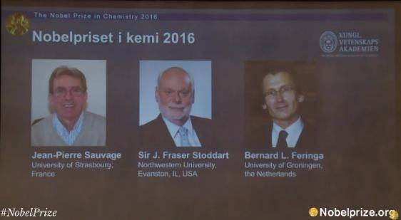 諾貝爾獎官方消息,Jean-Pierre Sauvage, Sir J. Fraser Stoddart 和Bernard L. Feringa獲得了今年的諾貝爾化學獎學獎,他們分別來自法國、美國、荷蘭。獲獎原因為“分子機器的設計和合成”。