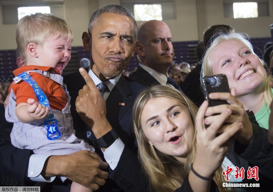 當地時間2016年11月1日,美國俄亥俄州,總統奧巴馬舉行集會演講,為民主黨總統候選人希拉里拉票,F場的一名小朋友吸引了奧巴馬的注意,他再次展示了自己對于孩子的親和力,抱著萌娃嘟嘴和現場民眾合影,只是這名寶寶并不是太開心,在總統懷里放聲大哭。