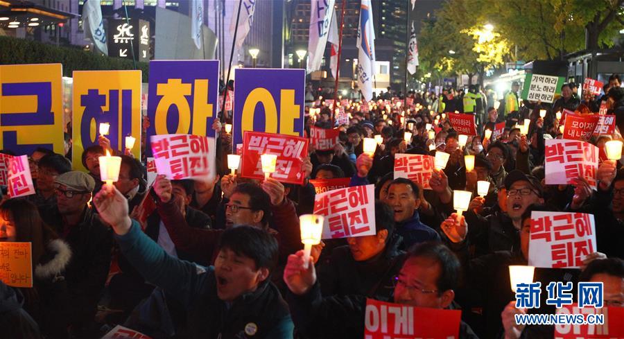 11月3日,在韓國首爾清溪川廣場附近,韓國民眾手舉寫有“樸槿惠下臺”的標牌參加集會。當日,百余名韓國民眾在清溪川廣場附近舉行燭光集會,抗議“親信干政”事件,要求總統樸槿惠下臺。 新華社記者姚琪琳攝