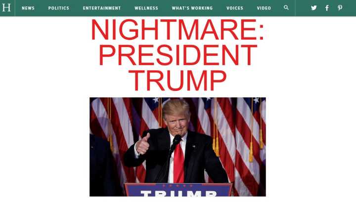 北京時間11月9日,特朗普贏得2016年美國總統選舉。雖然特朗普的參選在一年前曾被視作笑料,但本次選情地圖竟令人“大跌眼鏡”般多地飄“紅”,特朗普更是早于希拉里得到270張選舉人票。不出意外,在大選結果愈發明朗之際,已有希拉里支持者沮喪大哭,隨后,美國多地甚至爆發示威以抗議特朗普當選。在多數美媒還在報道選情結果時,美國《赫芬頓郵報》就在網站首頁首屏以《噩夢:特朗普總統》為題,來評論美國這一“難以想象”的選舉結果。