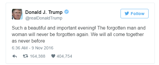 “如此美妙和重要的夜晚!被遺忘的男男女女們,從此你們不會再被忘記。我們將前所未有的團結起來,”這是特朗普當選美國第45任總統后發的第一條推特。
