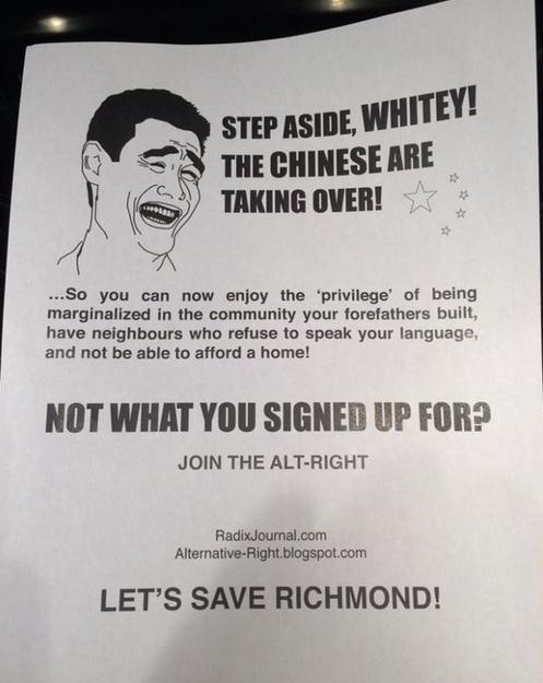 報道稱,大溫哥華地區(qū)列治文市(一個擁有大量華裔人口的城市)的一些居民在他們的郵箱里面發(fā)現(xiàn)了一些傳單,該傳單上鼓動白人加入一個名為"Alt-Right"的運動,號召白人“一起對抗華人群體,拯救被華人搶占的列治文市”。