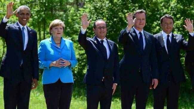 照片上從左到右依次是:美國總統奧巴馬、德國總理默克爾、法國總統奧朗德、時任英國首相卡梅倫和意大利總理倫齊。