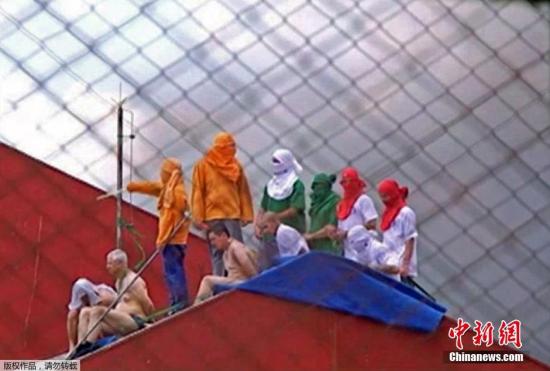 資料圖:當地時間2014年10月14日,巴西巴拉那州,當地監獄爆發騷亂,蒙面囚犯將12名警衛和部分囚犯扒光作為人質挾持至屋頂。