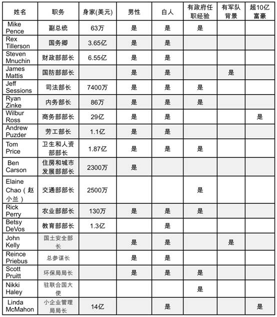 【環(huán)球網(wǎng)報道 記者 查希】據(jù)美國彭博社1月3日撰文《特朗普的60億內(nèi)閣:男性為主、白人居多、沒有從政經(jīng)驗》,稱特朗普按照自己的想法組建了一個內(nèi)閣。 彭博社稱,作為第一個億萬富翁美國總統(tǒng),他任命了2位超10億富翁以及多位億萬富翁,這個內(nèi)閣的凈身價達到總計56億美元;其中兩位進入內(nèi)閣或達到內(nèi)閣部長職位的被任命者是退役將領(lǐng);只有一半人有從政經(jīng)歷。內(nèi)閣成員中的大多數(shù)人與華爾街及美國企業(yè)界有緊密的聯(lián)系。他的內(nèi)閣與其前任相比將有很大的不同。 以下是特朗普內(nèi)閣提名人選: