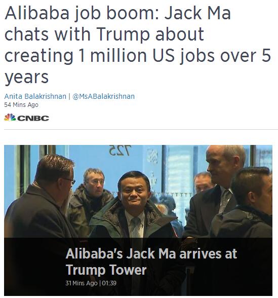 起初,CNBC援引消息人士的話稱,馬云此次會見特朗普,主要是聊阿里巴巴最新的美國擴張計劃。這份計劃包括未來5年在美國創造100萬就業崗位。CNBC顯然對此充滿期待,并將這個點當做標題。