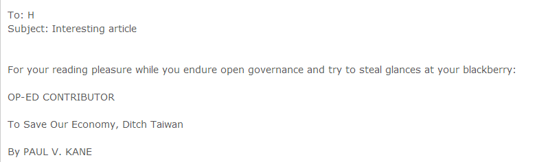 【環球網綜合報道 郭鵬飛】2011年11月10日,《紐約時報》曾經刊登一篇題為《為拯救美國經濟,舍棄臺灣吧!》(To Save Our Economy, Ditch Taiwan)的文章。作者是哈佛大學肯尼迪學院國際安全問題的前研究員保羅·凱恩。事隔多年,臺灣東森新聞云、中時電子報等多家媒體14日爆出一則驚人消息。在維基解密曝光的希拉里一封郵件中,她曾經公然為該文章“點贊”,稱“這個想法很聰明,讓我們來討論吧。”消息一出,臺灣民眾一片嘩然。要知道,在臺灣,一直有不少民眾對希拉里的政見表示支持。