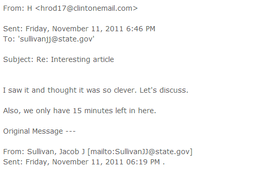 根據維基解密公布信息顯示,希拉里在2011年11月11日的私人郵件中提到,為拯救美國經濟,希拉里顧問的雅各布·沙利文(Jacob Jeremiah Sullivan)通過郵件向希拉里轉發了該文章,郵件主題注明“有趣的文章”。郵件內文寫到,“當你正在忍受你公開的管理工作時,這將給你帶來閱讀樂趣,試著瞅一眼你的黑莓手機吧。”