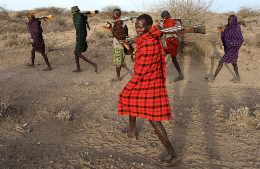 據路透社2月14日報道,肯尼亞10日宣布,持續干旱已釀成“國家災難”。肯尼亞總統肯雅塔發表聲明,呼吁國際伙伴伸出援手,幫助肯尼亞度過這場嚴重的旱災。在肯尼亞旱災肆虐的北部,全副武裝的“牛仔”闖進農場和野生動物保護區為牲畜爭奪水源,導致暴力沖突頻發,造成至少11人死亡,一家賓館被燒毀。圖為Turkana部落男性牧民扛槍巡視牧區,嚴防敵對部落“入侵”。編譯劉揚子(參考消息獨家編譯,轉載請注明出處)