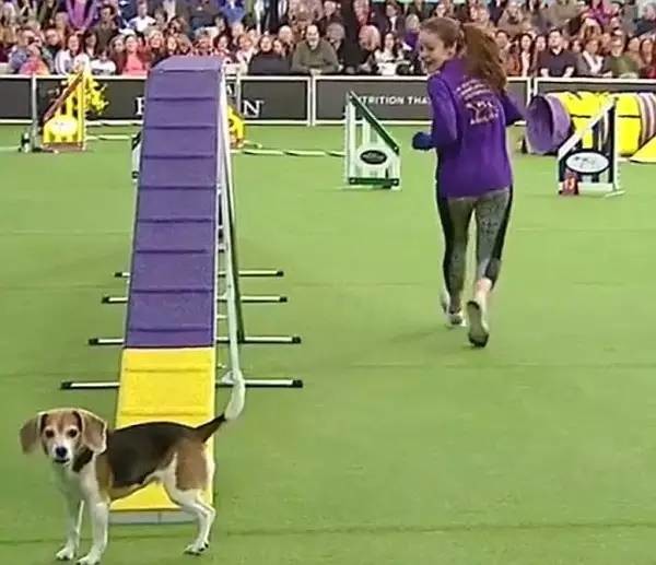 隨后,更滑稽的一幕出現了。當面對陡坡障礙時,米婭果斷掉頭離開。在米婭結束比賽后,犬展解說員打趣道:“真是‘讓人眼前一亮’的‘精彩’表現!”