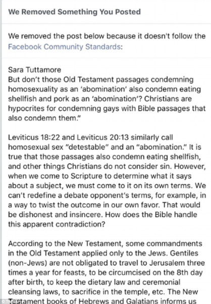 約翰斯頓太太在“臉譜”上有7.5萬名粉絲,他們的推送也常常被隱藏,帳號也常常被凍結,甚至有些人的主頁都被刪除了。她表示:“我們感到很沮喪,因為我們舉報一些色情內容或者人身威脅的內容時,‘臉譜’回應說這些內容不違反他們的論壇規約。但是基督教義中關于同性戀的陳述也不違反他們的論壇規約,他們就是在監視信奉基督教的用戶!