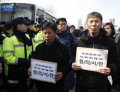 2月28日,在韓國首爾的韓國國防部門前,韓國民眾代表手持抗議部署“薩德”系統(tǒng)的信函。新華社記者姚琪琳攝