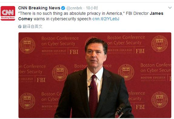 美國有線電視新聞網3月8日報道稱,科米8日出席由FBI與波士頓學院(Boston College)共同舉辦的首屆波士頓網絡安全會議。他在會中談到,自從2013年前國安局雇員斯諾登爆料國家安全機構監聽民眾之后導致各界關注的計算機加密問題。他認為美國人不應該期待擁有絕對隱私,“在美國是沒有絕對隱私可言,也沒有逍遙法外之處。”