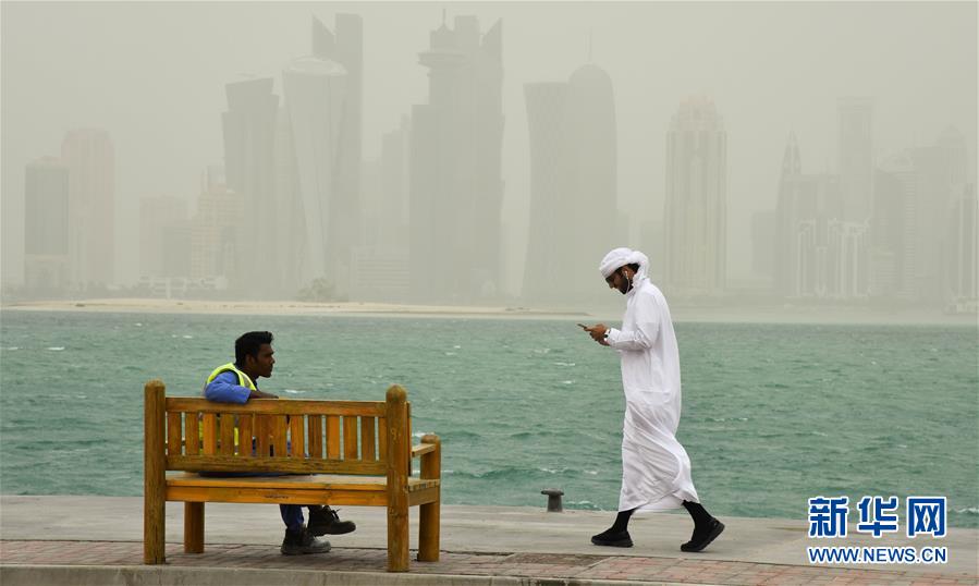 3月14日,一名男子在卡塔爾多哈海邊大道行走。沙塵暴14日襲擊卡塔爾首都多哈,城市能見度降低。 新華社發(尼庫攝)