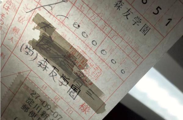 《每日新聞》18日公開(kāi)了這張收據(jù)。匯款單上匯款金額為100萬(wàn)日元,匯款人一欄被修正貼改過(guò)后寫著森友學(xué)園,但透過(guò)修正貼可以看見(jiàn)后面的“安倍晉三”四個(gè)字。修改處蓋有當(dāng)時(shí)處理這筆匯款業(yè)務(wù)的郵局印章。