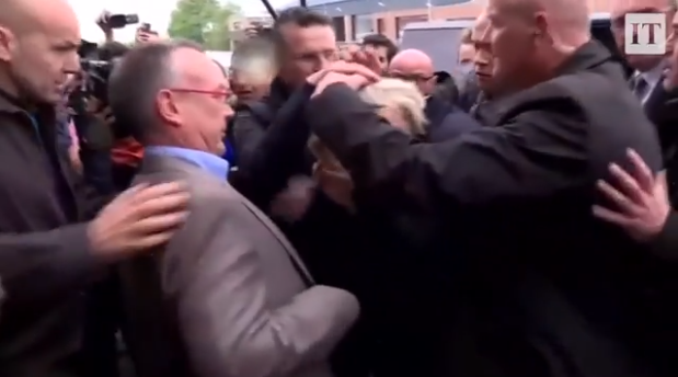 勒龐的私人保鏢當時用手掌擋住她的頭,使其沒有被投擲來的雞蛋砸到。