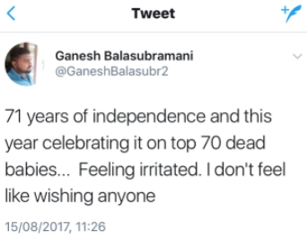 網(wǎng)友@SIDDHARTHA MISHRA:獨立70周年紀(jì)念日,死了70個孩子,而莫迪卻在紅堡(作獨立日演說)。
