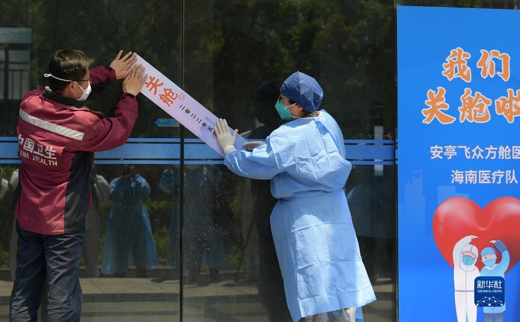 5月4日,海南省醫療隊領隊李文秀(左)和嘉定區衛健委工作人員一起為安亭飛眾方艙醫院大門粘貼關艙封條。新華社記者 李賀 攝