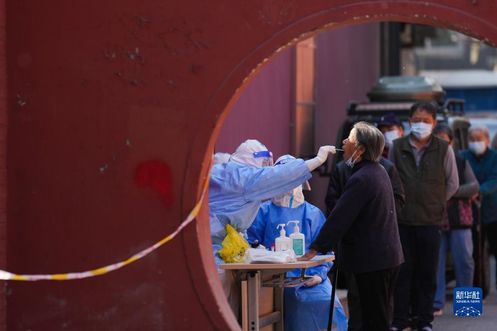 5月2日,在北京市朝陽區八里莊街道紅廟北里社區,醫護人員在管控區為居民進行核酸采樣。新華社記者 鞠煥宗 攝