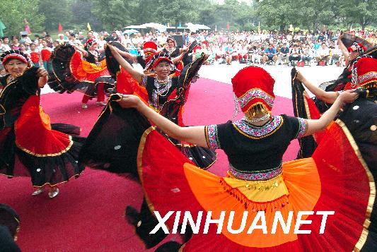 6月23日,北京市豐臺區東高地街道居民在豐臺花園表演舞蹈。當日,作為第五屆“北京2008”奧林匹克文化節中的一項活動,“激情奧運,舞動豐臺”廣場舞蹈展演活動在豐臺區舉行。來自豐臺區各個街道、鄉鎮的千余名群眾參加了這項文化與健身活動。新華社記者 張旭 攝