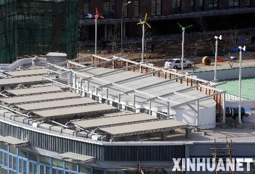 2008年奧運(yùn)會(huì)期間,供各國(guó)運(yùn)動(dòng)員、教練員等相關(guān)人員住宿的奧運(yùn)村所用的可再生能源利用設(shè)備系統(tǒng)將從再生水熱泵冷熱源以及太陽(yáng)能中獲取789萬(wàn)千瓦時(shí)的能量用于空調(diào)制冷和生活熱水,節(jié)約標(biāo)煤3077噸,相當(dāng)于減排二氧化碳8000噸。圖為2月28日拍攝的安裝在奧運(yùn)村內(nèi)屋頂上的風(fēng)力發(fā)電機(jī)。 新華社記者羅曉光攝