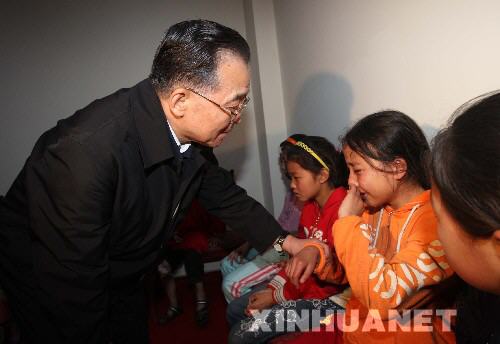 5月13日,溫家寶總理在四川綿陽九洲體育館地震災民安置點看望災民。這是溫家寶在安慰受傷兒童。 新華社記者姚大偉攝