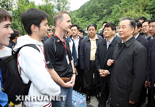 5月14日,國務(wù)院總理溫家寶抵達地震重災區(qū)四川北川縣察看災情。這是溫家寶在北川縣曲山鎮(zhèn)對幾位美國志愿者說,謝謝你們,我代表中國政府感謝美國人民對這場特大自然災害的受災地區(qū)所提供的幫助。 新華社記者姚大偉攝