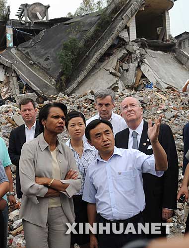 29日,賴斯對(duì)四川地震災(zāi)區(qū)進(jìn)行了不到四個(gè)小時(shí)的訪問。賴斯是迄今為止訪問中國地震災(zāi)區(qū)的美國最高官員,這也是她年內(nèi)第二次訪問中國的第一站。