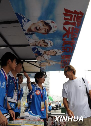 8月8日,第29屆北京奧運會志愿者為前來咨詢的外國友人介紹情況。新華社記者王長山攝