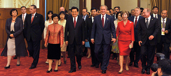 8月8日,中國國家主席胡錦濤和夫人劉永清為出席北京奧運會的貴賓舉行歡迎宴會。這是賓主步入宴會廳。新華社記者 樊如鈞攝