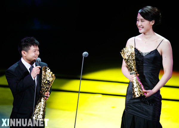 11月21日,獲得最佳男子新人獎的北京奧運會舉重冠軍龍清泉(左)和獲得最佳女子新人獎的北京奧運會游泳冠軍劉子歌發表獲獎感言。當日,2008中國十佳勞倫斯頒獎儀式在北京舉行。 新華社記者王麗莉攝