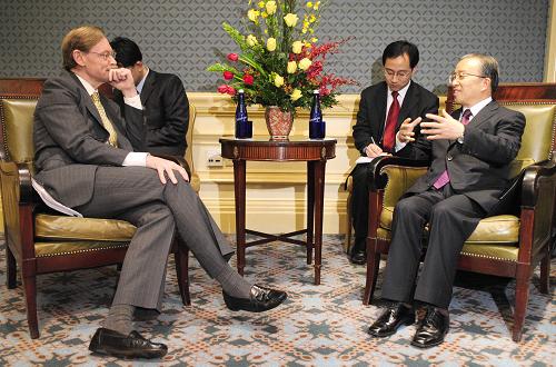 12月11日,正在美國進行工作訪問的中國國務委員戴秉國(前右)在華盛頓會見世界銀行行長佐利克(前左)。應美國政府邀請,戴秉國于10日抵達紐約,開始對美國進行工作訪問并出席第六次中美戰略對話。新華社記者 張巖 攝