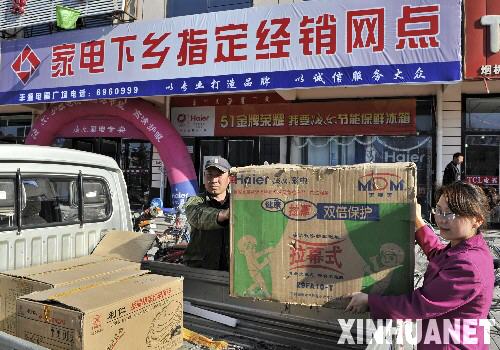 4月8日,錫林郭勒一家商場的售貨員幫助顧客搬運購買的家電下鄉產品。內蒙古農牧區自2008年12月1日開展家電下鄉活動以來,家電下鄉銷售網點已達到1126家,銷售家電下鄉產品超過2萬件。新華社記者李欣攝