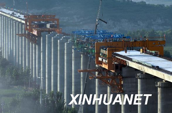 石太鐵路冶河特大橋建設(shè)者在為空中現(xiàn)場澆筑橋梁做準(zhǔn)備(攝于9月6日)。全長1688.8米的冶河特大橋是正在建設(shè)中的石太鐵路(石家莊至太原)客運專線全線控制工期的重點工程。擔(dān)負(fù)建橋施工的中鐵二十二局集團四公司的建設(shè)者采用國際先進的空中現(xiàn)澆技術(shù),首次在40米高空采用移動模架現(xiàn)澆每孔900噸重的大型箱梁,解決了地面澆筑橋梁大面積占用耕地、大型橋梁難以輸送等問題,開創(chuàng)了我國空中現(xiàn)澆技術(shù)建設(shè)橋梁的先例。
