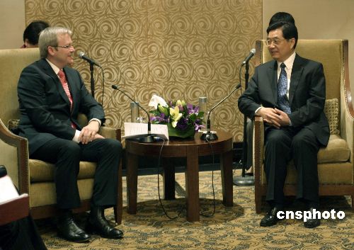 資料圖:2007年9月7日,中國國家主席胡錦濤在悉尼會見澳大利亞反對黨領袖陸克文。 中新社發(fā) 賴海隆 攝