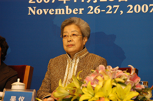 2007年11月26日9時,由國家質檢總局、衛生部、世界衛生組織主辦的國際食品安全高層論壇在北京釣魚臺國賓館舉行。論壇圍繞“實現食品安全的協調行動”等議題進行主旨發言。 圖為吳儀副總理主席臺就座。新華網 張泳攝