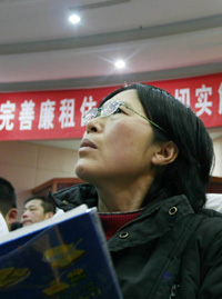 前不久,江西省九江市中心城區2007年度第三批經濟適用住房暨廉租房公開搖號在該市圖書館舉行。在市監察局兩名監督員的監督下和兩名公證人員的全程公證下,直接搖號產生1059個中簽家庭和對應房號。圖為一位市民在期盼著自己搖中經濟適用房號碼。新華社記者:章武 攝