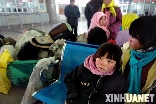 1月20日,一名小女孩與家長在汽車站內等待班車開通的信息。 因持續降雪,19日寧夏氣象臺發布了道路結冰紅色預警信號,銀川市運管部門緊急通知客運車站全線停運,近千個班次的公路客運受到影響。不少旅客滯留在汽車站內,希望第一時間得到開通的信息,及早踏上返鄉之路。新華社記者 李紫恒 攝