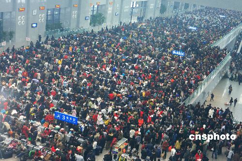 2008年1月27日下午,武昌火車站候車室內擠滿了等待乘車的旅客。當日,受雨雪天氣影響,廣鐵集團湖南境內京廣線供電接觸網多處斷電,電力機車無法通行,致使旅客列車出現多列晚點。武昌火車站采取措施,在新落成的候車室內開通暖氣,確保滯留旅客不受凍。 中新社發 宋建春 攝