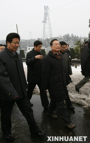 1月29日,中共中央政治局常委、國務院總理溫家寶在湖南湘潭市郊外查看電力設施受損情況。 新華社記者姚大偉攝