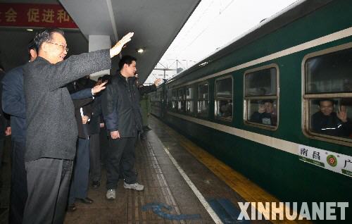 1月30日,中共中央政治局常委、國務(wù)院總理溫家寶在廣州火車站看望旅客。這是溫家寶總理在站臺上為一列發(fā)往武昌的旅客列車送行。這列火車是從南昌緊急調(diào)來支援廣州車站的。 新華社記者姚大偉攝
