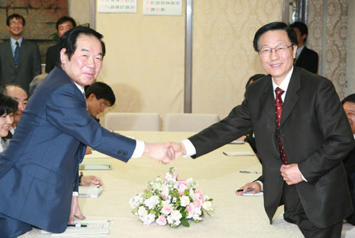 3月23日,中國財政部長謝旭人(右)和日本財務(wù)大臣額賀福志郎(左)在日本首都東京舉行會談。當(dāng)天,第二次中日財長對話會議在東京舉行。新華社記者 任正來 攝