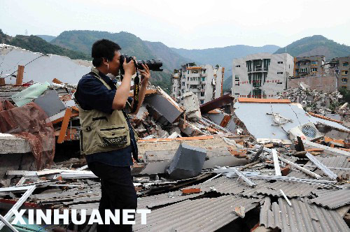 2008年5月18日,新華社攝影記者李濤在地震重災區――北川縣采訪。 新華社發