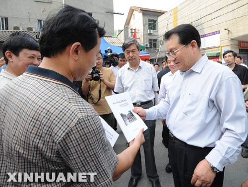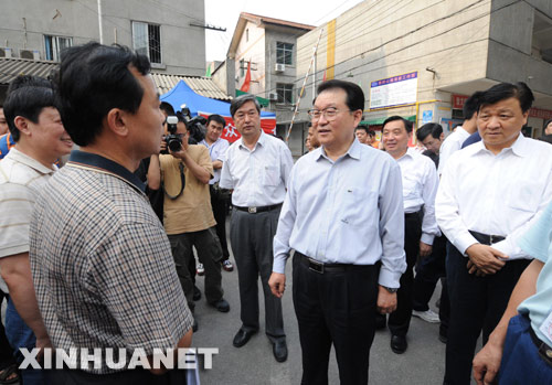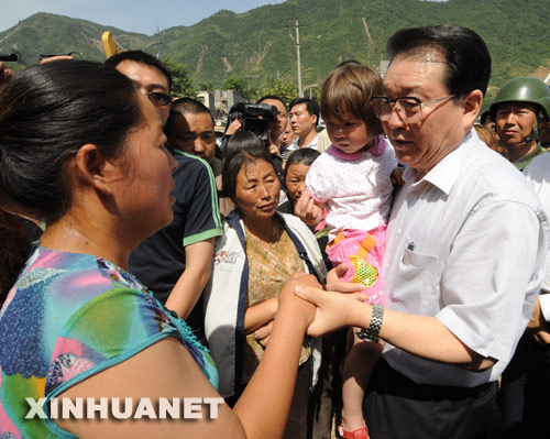 這是6月2日,李長春在平武縣南壩鎮(zhèn)察看災情,慰問災區(qū)干部群眾和救援人員,指導抗震救災工作。 新華社記者 李學仁 攝
