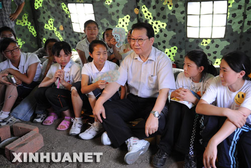 李長春一直牽掛著北川中學學生的學習和生活情況。2日下午,他專程趕到設在長虹培訓中心的北川中學臨時學校,走進教室,看望在這里復課的學生。在這次特大地震中,北川中學有多名教師和學生臨危不懼、搶救同學,李長春對他們的英勇行為給予高度評價。他說,要運用多種形式,大力宣傳災區(qū)廣大教師和學生在抗震救災中的感人事跡,給人以信心和力量。曾經(jīng)在中央電視臺《愛的奉獻》大型募捐活動中哭訴地震經(jīng)歷的高三學生劉怡雪拉著李爺爺?shù)氖终f,我在地震中失去了親人,但我得到了全社會那么多的關愛,今后我一定要堅強起來,不再哭了。李長春鼓勵劉怡雪和同學們盡快從悲痛中解脫出來,抓緊復習功課,以飽滿的狀態(tài)積極準備高考,力爭取得優(yōu)異的成績。李長春還走進學生居住的帳篷,席地而坐,與幾名初一學生親切交談,仔細詢問每頂帳篷住幾個人、生活習慣不習慣。李長春說,原來的校舍雖然垮塌了,但困難只是暫時的,黨和政府一定會為你們建設一個更加堅固、更加漂亮的新學校。