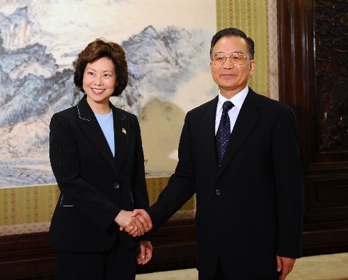 8月23日,中國國務(wù)院總理溫家寶在中南海紫光閣會見前來出席北京奧運(yùn)會閉幕式及相關(guān)活動(dòng)的美國總統(tǒng)代表團(tuán)團(tuán)長、勞工部長趙小蘭。新華社記者 李濤 攝