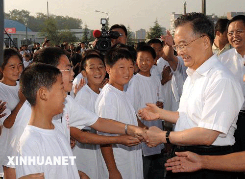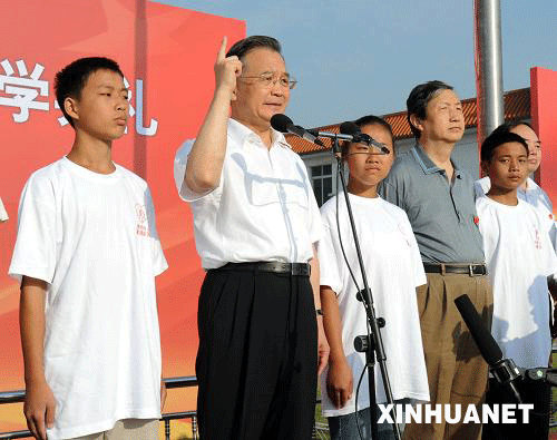 9月1日,正在四川地震災區考察的中共中央政治局常委、國務院總理溫家寶來到設在四川長虹集團培訓中心的北川中學臨時學校,參加正在這里舉行的秋季開學典禮。新華社記者 黃敬文 攝