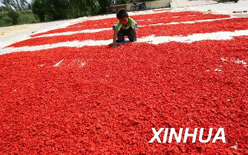 8月19日,寧夏回族自治區中寧縣一位小朋友在晾曬枸杞。新華社記者 高學余 攝
