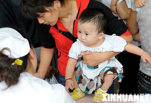 資料圖片:9月19日,家長帶著孩子在南京市兒童醫(yī)院用會議廳改成的專病門診區(qū)登記,準備接受檢查。連日來,全國各有關地方認真貫徹黨中央、國務院關于對三鹿嬰幼兒奶粉受三聚氰胺污染重大安全事故作出的重要指示精神,積極采取各種有效措施,全力救治和篩查泌尿系統(tǒng)結(jié)石患兒。新華社記者 孫參 攝